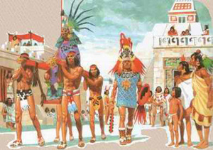 ![]() | 2. У XIV ст. на Мексиканському нагір’ї утворилася держава ацтеків. Ацтеки - спільна назва близьких по культурі народностей, які говорили мовою науатль, Більшість з них мали власні міста - держави і царські династії. Серед цих племен головне місце займали теночки, тому «ацтеками» інколи називають тільки їх. Столицею було місто Теночтітлан (сучасне Мехіко). Ацтеки скористалися досягненнями народів, які раніше на селяли до лину озера Тескоко і невдовзі стали вмілими землеробами, навчившись вирощувати овочі на плотах-городах просто серед озера. Ацтеки були вмілими ремісниками: гонча рями, ткачами, металургами, навчившись обробляти золото і мідь. Місцеві купці використовували як гроші плоди какао. З плодів також готували напій шоколад. Ацтеки не знали колеса и в’ючних тварин. Вантажі переносили ношами, а водою мандрували човнами – каное. Столиця країни була розташована на острові і побудована за певним планом. У будинках існувала каналізація. Місто прикрашали кам’яні споруди та величезні храми на честь бога дощу і сонячного бога війни. Місто прикрашали широкі прямі вулиці, розкішні палаци, величні храми, кам’яні скульптури. Все це було поєднано мережею каналів. Акведуки забезпечували місто питною водою. | ![]() |